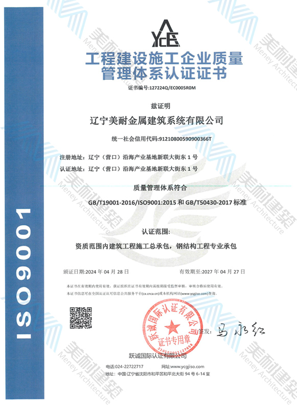 遼寧美耐金屬建筑系統有限公司位于遼寧(營口)沿海產業基地,專注于預制金屬建筑系統領域,是一家集工業建筑設計、制作、施工及相關的技術咨詢與服務為一體的綜合性服務企業。作為國家鋼結構協會會員、中國建筑金屬結構協會會員單位與國家高新技術企業,美耐建筑集建筑工程施工總承包、鋼結構工程專業承包等多種資質于一身,并擁有22項鋼結構建筑領域專利,9項軟件著作權。